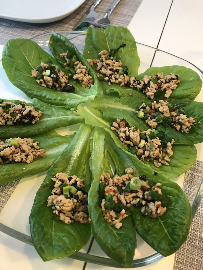 Tein sunnuntaina, koska aikaa oli, vihreän thaicurrykastikkeen lisäksi myös alkuruuan. Päivän teemaan sopi hyvin samasta kirjasta-Korianteria ja sitruunaruohoa-poimittu ohje yrttisestä broilerinjauhelihasta, jonka päätin tarjota salaatinlehdestä. Salaatinlehti oli tällä kertaa Romainensalaatti, myös sydänsalaatti käy hyvin. Pääasia, että lehti on kuppimainen ja sen pystyy käärimään rullalle. Tämä ruoka on kirjan mukaan kambodzalainen ja tarjotaan suoraan pannusta riisin kera. Koska tämä oli meillä alkuruoka, päädyin laittamaan sen salaatinlehdelle. Kastiketta oli kuitenkin niin paljon, että laitoin loput erilliselle tarjoiluastialle ja se kelpasi pojille melkein paremmin kuin vihreä curry. Pöydässä ollut kuopuksen ystäväkin söi tätä kaksi lautasellista. Vaikka mausteita on paljon, on kokonaisuus silti hyvin mieto, mutta maistuva ja lapsiperheessä käytän usein chilinä Pirkan mietoa chiliä. Tai sitten ostan Lidlstä chilipaketin, mutta laitan sitä ohjetta hieman vähemmän, jos lapset syövät samaa ruokaa.