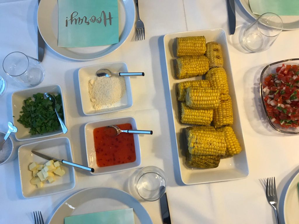 Lisukkeeksi tein grillattua maissia, joka oli poikien toive. Jokainen ruokailija sai oman makunsa mukaan laittaa lämpimän maissin päälle joko tai voita, sormisuolaa, parmesanjuustoa, tuoretta korianteria tai sweetchilikastiketta.
