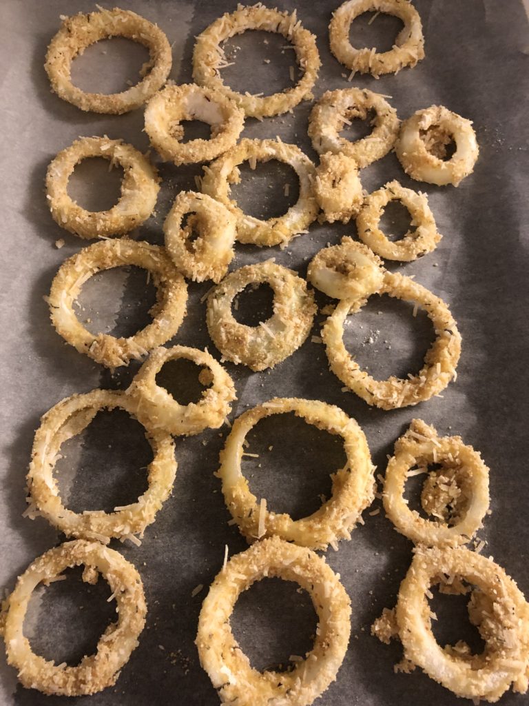Valmista sitten sipulirenkaat. Kuori ja viipaloi sipuli renkaiksi. Erottele renkaat toisistaan. Laita ensimmäiseen syvään lautaseen vehnäjauhot. Laita seuraavaan syvään lautaseen kananmunat ja vatkaa haarukalla niiden rakenne rikki. Laita kolmanteen syvään lautaseen korppujauhot, parmesaaniraaste sekä timjami. Sekoita.