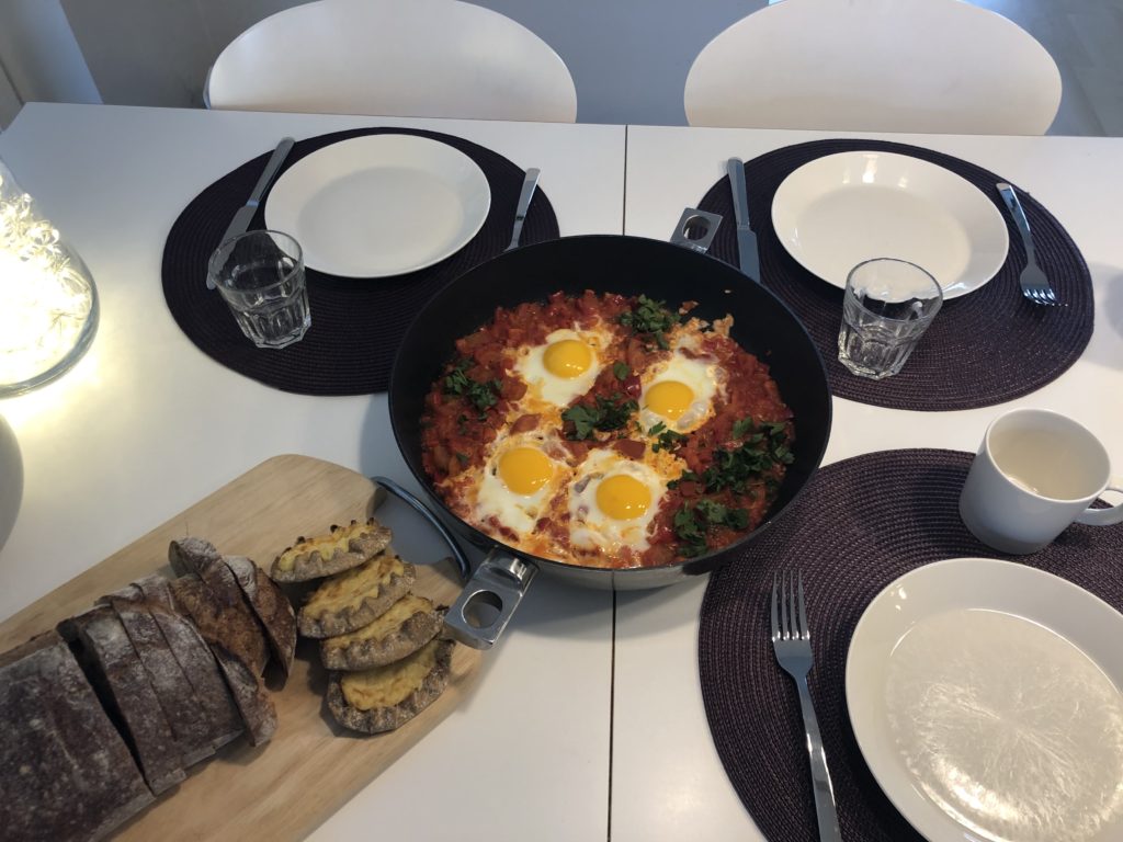 Lauantaiaamuna poikien lätkät alkoivat vasta 11:45 ja 13:45, joten meillä oli mahdollisuus rauhalliseen aamupalaan. Kun näitä aamuja on, hyödynnän sen aina omalla urheilulla sekä pitkänkaavan aamupalalla. Eilen illalla Glorian ruoka&viini lehtiä selatessani vastaan tuli tämä turkkilainen Menemen. Olen aiemminkin julkaissut shaksukan ohjeen täällä, mutta tämä on siis tällä kertaa turkkilainen versio ja raaka-aineiltaan hyvin yksinkertainen ja mielestäni nopea valmistaa. Älä pelästy tomaattien kalttausta, se on loppujen lopuksi todella helppoa ja siihen menee reilusti alta 5 minuuttia. Ohjeessa oli yhtenä raaka-aineena vihreät turkkilaiset suippopaprikat ja niiden saatavuudesta varoiteltiin jo ohjeessa. Lähimmästä Citymarketista en niitä saanut, joten ostin ehdotettuja punaisia suippopaprikoita. Mies muisteli, että olisi niitä lähi Lidilissä kuitenkin joskus nähnyt. Tällä(kään) kertaa aika ei riittänyt useampaan ruokakauppaan, joten ostin kaikki viikonlopun ruuat Citymarketista. Jos saat noita vihreitä turkkilaisia suippopaprikoita kaupasta, niin käytä ihmeessä, jos et, niin käytä hyvällä omallatunnolla punaisia. Mutta siis nimenomaan suippopaprikoita, jotka ovat makeampia kuin tavallinen paprika. Tämän juomana sopii ehdottomasti tee paremmin kuin kahvi ja varsinkin haudutettu tee, suosittelen lämpimästi.