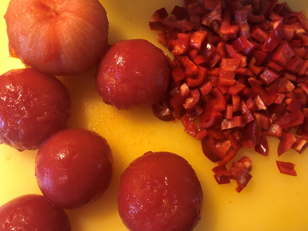 Leikkaa paprikat ja tomaatit pieniksi kuutioiksi.