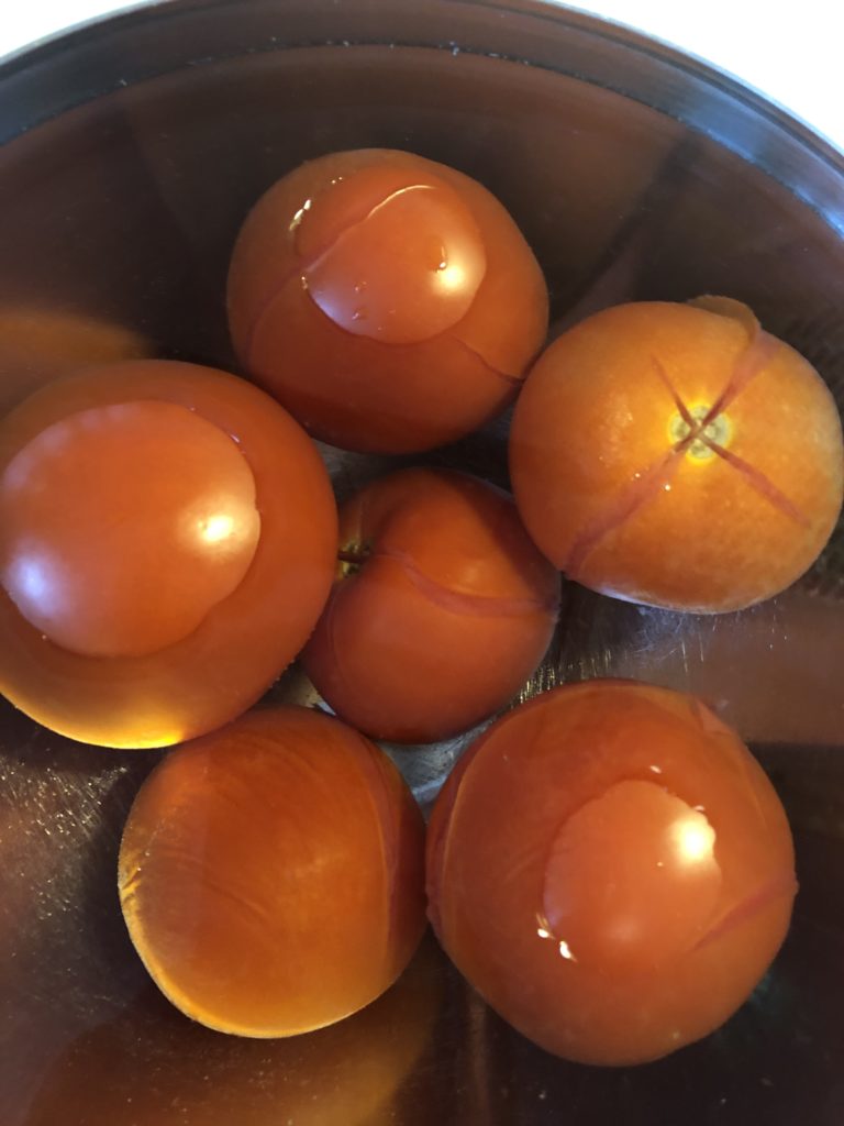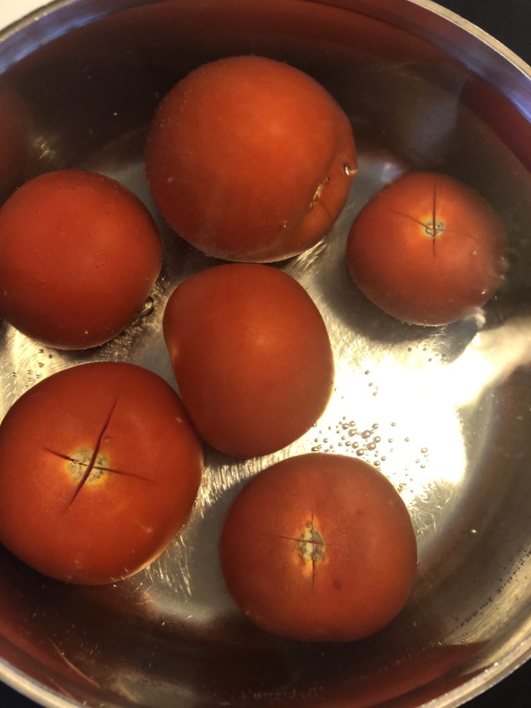 Varmista, että kananmunat ovat huoneenlämpöisiä. Tee ristiviilto tomaatteihin ja laita ne kiehuvaan veteen 30 sekunniksi. Jos ne ovat isoja, esim terttutomaatteja, niin sitten 1 minuutiksi.