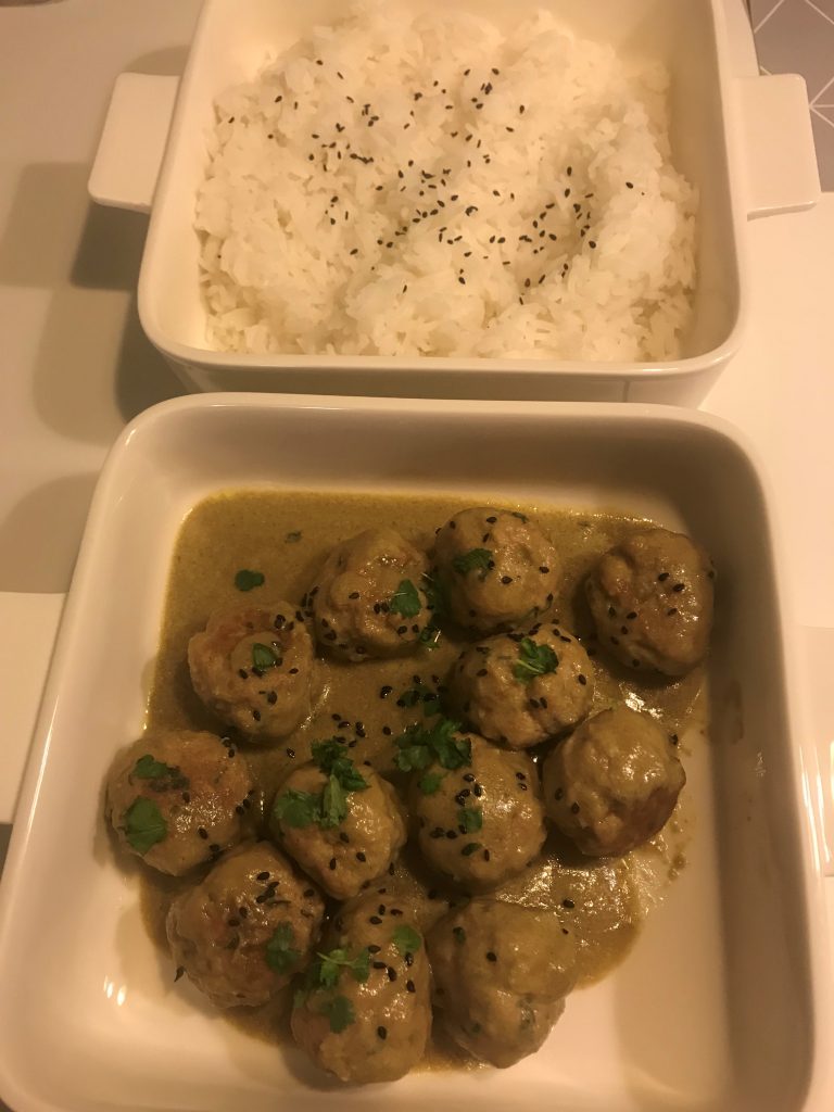 Broilerin jauheliha on ollut ihan hyvä lisä lapsiperheen arkiruokia helpottamaan. Nämä pyörykät valmistuvat nopeasti ja kimmokkeena tälle ruualle oli avattu kookosmaito, josta olin tarvinnut vain kaksi ruokalusikallista viikonlopun ruokaan. Siirrän muuten aina avatusta metallitölkistä sisällön puhtaaseen astiaan odottamaan, jos en tarvitse kaikkea heti. Näin kookosmaito tuli käytettyä, eikä mennyt hukkaan.