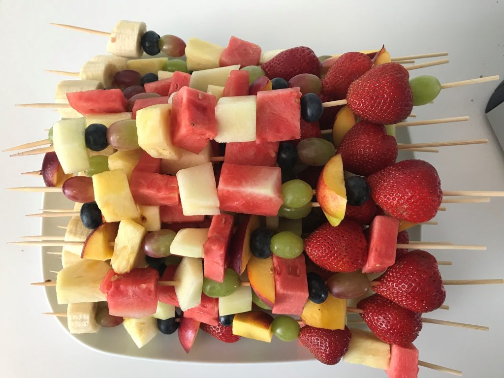 Olen vienyt useat kerrat hedelmävartaita. Ne ovat usein loppuneet nopeasti. Voit laittaa niihin kauden mukaan periaatteessa mitä vain, mikä pysyy vartaassa. Melonejakin voi laittaa eri lajeissa ja viinirypäleitä eri väreissä. Pääasia, että ne ovat värikkäitä ja houkuttelevia.