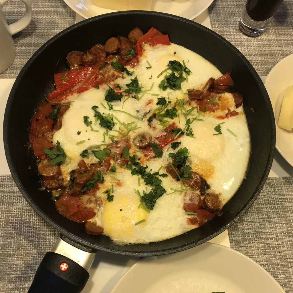 Etsiessäni viikonlopun ruokia Björck Huippukokin kotiruokaa kirjasta, vastaan tuli tämä chorizo-munakas aamiainen, joka pääsi heti kokeiluun. Viime sunnuntaina oli pitkästä aikaa sellainen aamu, että saimme rauhallisemman aamiaisen, koska esikoisen piti olla jäähallilla vasta kello 11:15 ja kuopuksenkin vasta 15:30. Esikoisella oli kuitenkin edessään 2,5 tunnin urheilusuoritus, joten aamiaisen tuli olla tukeva, jotta energiaa riittäisi.