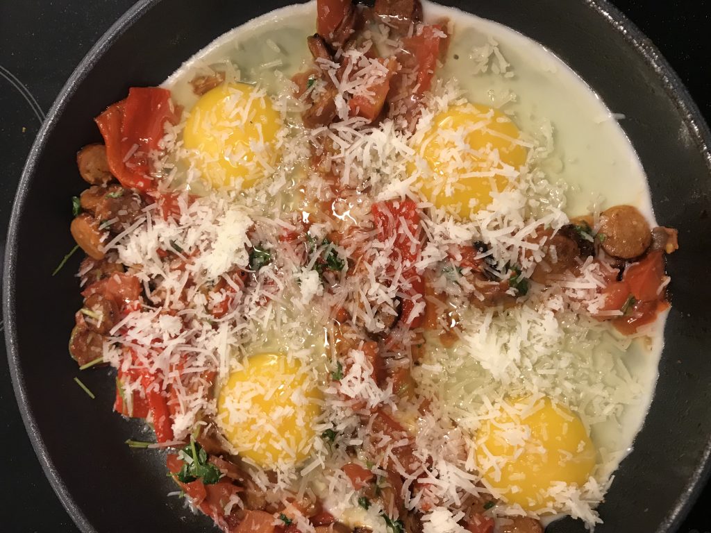 Laita kaikki ainekset takaisin pannuun ja tee tilaa kananmunille. Riko kananmunat koloihin. Ripottele manchego päällle, laske lämpöä ja laita kansi päälle. Paista munat kypsiksi ja jos haluat että munat jää keltuaisista raa’aksi, vahdi tarkkaan, ne kypsyvät nopeasti.