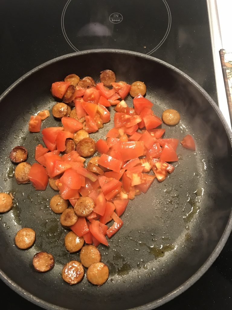 Paista chorizoja kuivalla pannulla siten, että saavat väriä. Lisää tomaatit pannulle ja paista pari kertaa käännellen. Laita chorizot ja tomaatit paprikoiden joukkoon astiaan. Sekoita.