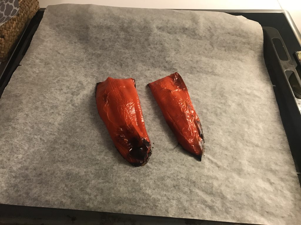 Kuumenna uuni 225C. Puolita paprikat ja poista siemenet. Laita pellille leivinpaperin päälle leikkuupinta alaspäin. Paista uunissa 15-20 minuuttia, siten että pinta mustuu. Ota paprikat pois uunista ja anna jäähtyä. Kun ne ovat jäähtyneet, poista kuoret. Mitä tummemmat, sen helpommin kuoret lähtevät. Suikaloi kuorittu paprika.