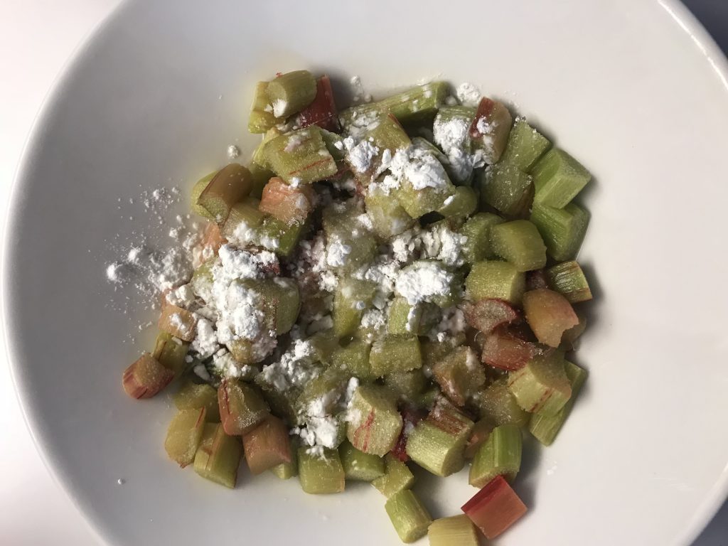 Sekoita raparperien joukkoon maissitärkkelys ja sokeri.