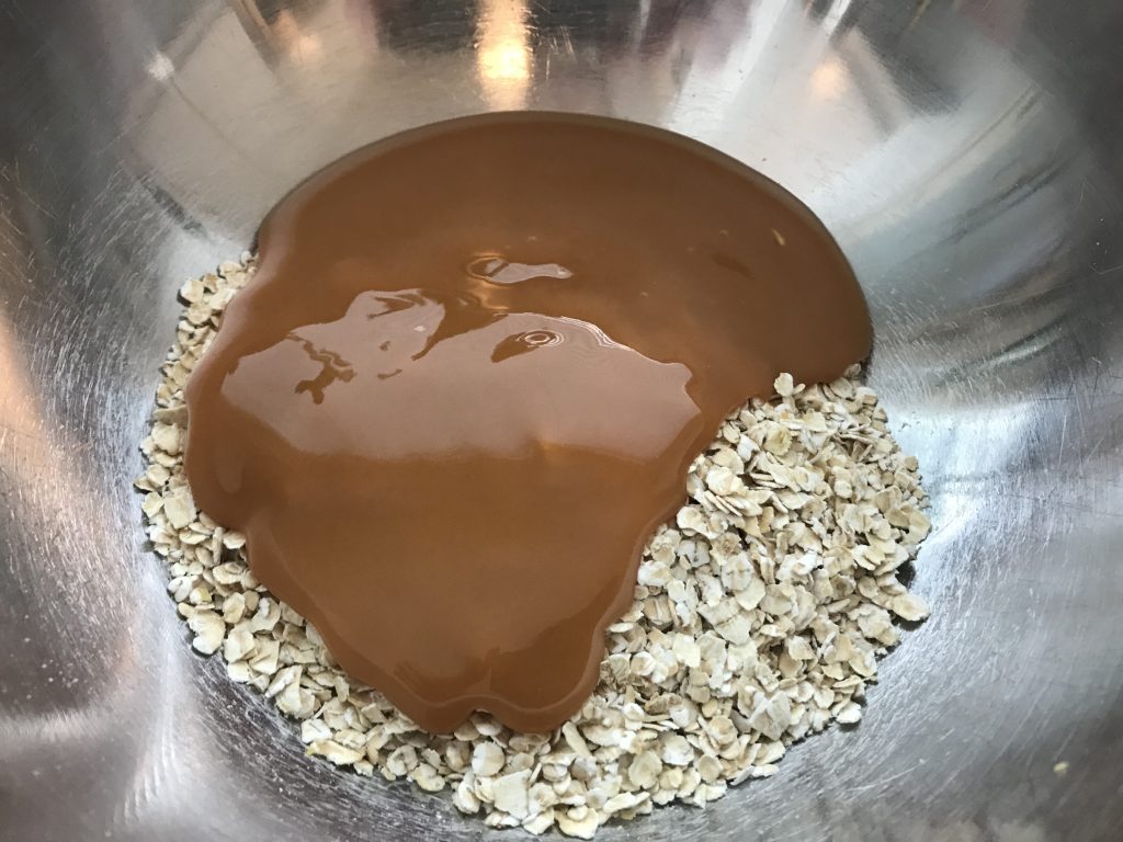 Yhdistä kaurahiutaleet ja kinuskikastike. Ja lisää pieni ripaus suolaa joukkoon.