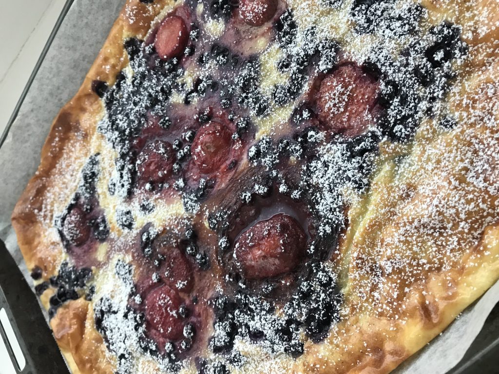 Sekoita kulhossa maito, jauhot ja yksittäin lisätyt kananmunat. Mausta taikina vaniljasokerilla. Anna taikinan turvota puoli tuntia. Kaada taikina uuninpellille leivinpaperin päälle. Levitä jäiset marjat päälle ja ripottele pinnalle sokeria. Paista 225 C asteessa noin 30 minuuttia. Koristele tomusokerilla ripotellen se siivilän läpi pannukakun päälle.