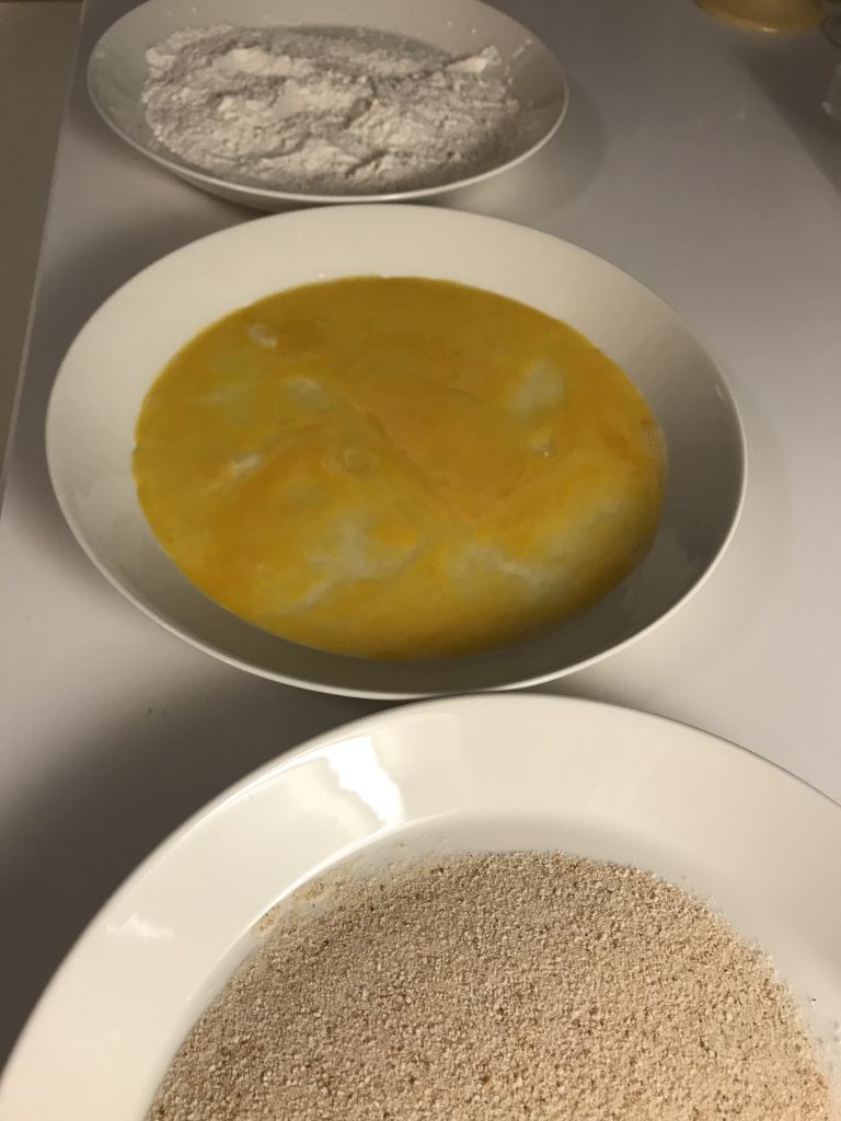 Sekoita vehnäjauhot, suola ja mustapippuri yhdellä lautasella. Riko kananmunat ja sekoita rakenne rikki toiselle lautaselle yhdessä veden kanssa. Ja mittaa korppujauhot kolmannelle lautaselle. Kääntele pihvit ensin jauhoseoksessa, sitten kananmunassa ja viimeiseksi korppujauhoissa.