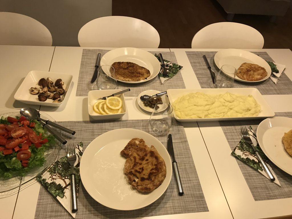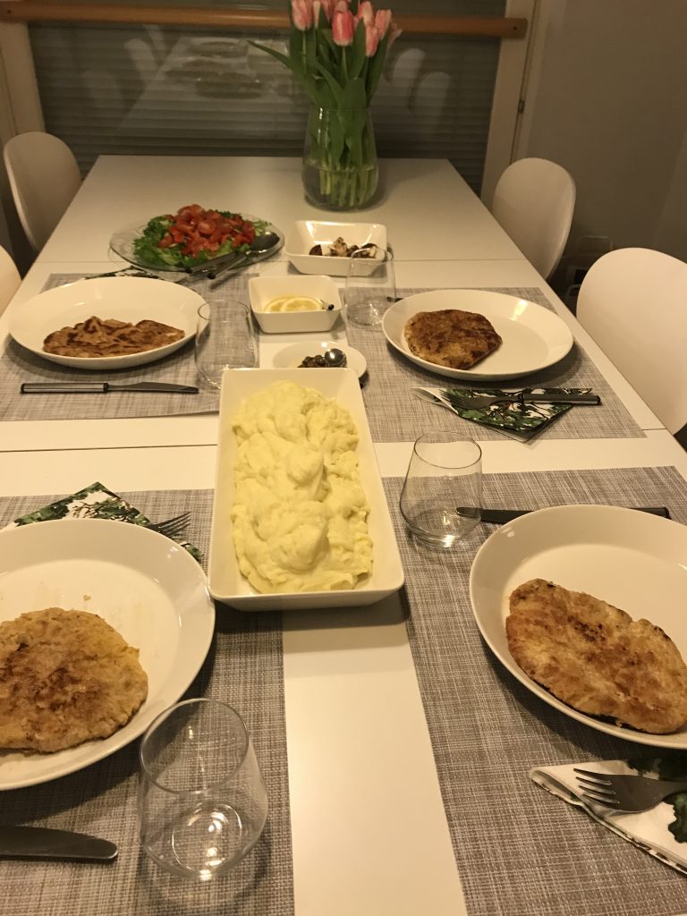 Viime sunnuntaina palasimme perheemme molempien aikuisten lapsuuden makuihin, nimittäin wieninleikkeeseen. Tämän ohella lehtipihvi oli se, mitä ravintolassa syötiin nuorina yhdessä omien vanhempien kanssa. Ja hyvältä maistui edelleen, esikoiselle maistui myös, kuopus ei taaskaan hurrannut ja soittanut fanfaareja. Noh, ajan myötä maku kehittyy, kuten isoveljellekin on käynyt. Kriittinen tekijä wieninleikkeessä on hyvä liha, ostin porsaan ulkofileen K-Supermarketin lihatiskiltä.