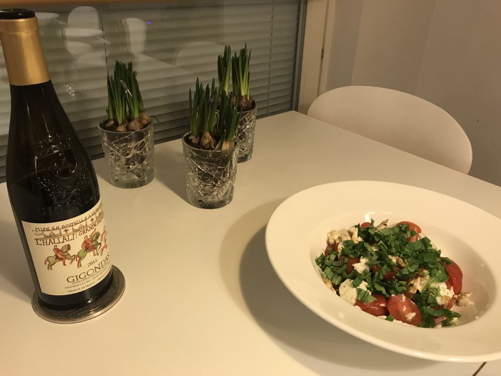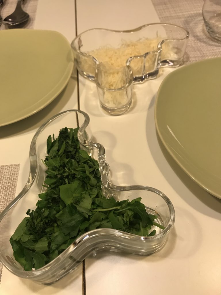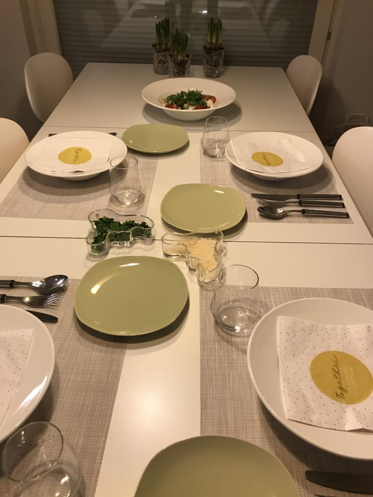 Ruoka oli yksinkertainen, joten ehdin myös miettiä kattausta. Käytän rohkeasti eri sarjoja ja värejä sekaisin. Tällä kertaa pöydästä löytyy sekä valkoista että vihreää. Aalto maljoja minulla on eri kokoisina ja värisinä ja käytän niitä surutta kattauksessa. Tällä kertaa laitoin toiseen parmesan raasteen ja toiseen silputun lehtipersiljan.