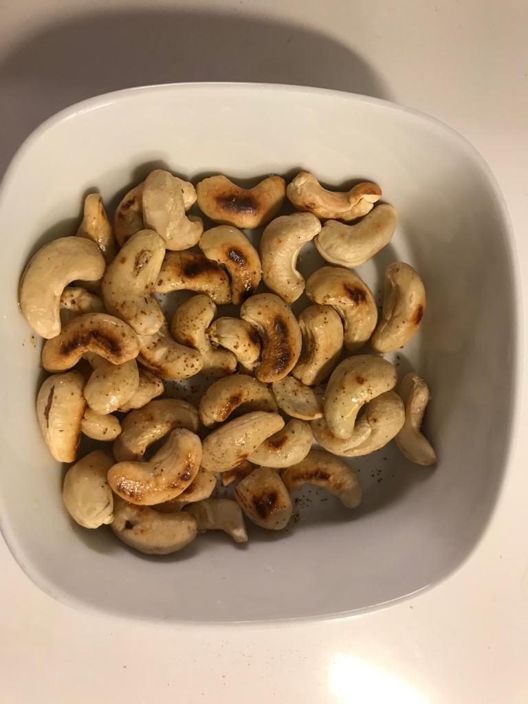 Paahda pähkinät kevyesti kuivalla paistinpannulla. Sirottele päälle vähän oliiviöljyä ja cayennepippuria. Anna jäähtyä. Muista maustaa pähkinät, saat salaattiin aivat toisen ulottuvuuden, kun pähkinät ovat erikseen maustettuja.