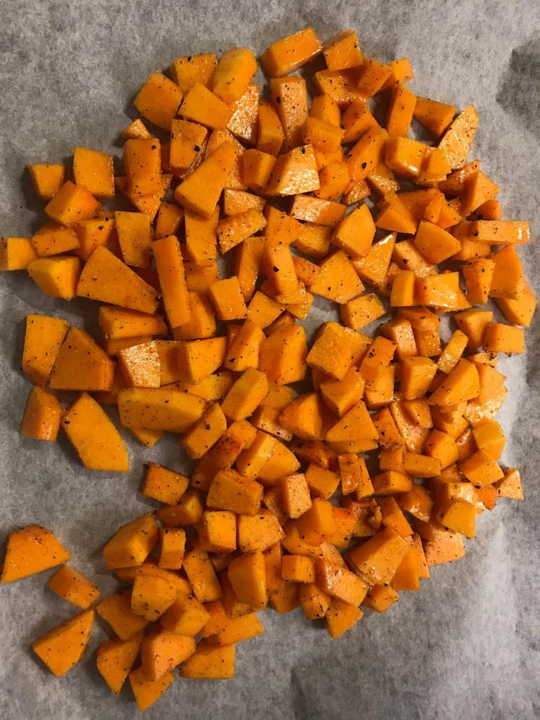 Kuumenna uuni 200 C. Laita kurpitsakuutiot astiaan, lisää oliiviöljy, kaneli, ruokosokeri, suola ja mustapippuri. Sekoittele käsin sekaisin ja kaada uuninpellille. Paahda uunissa 10-15 minuuttia, kunnes kurpitsanpalat ovat pehmeitä ja kauniin ruskeita. Anna jäähtyä.