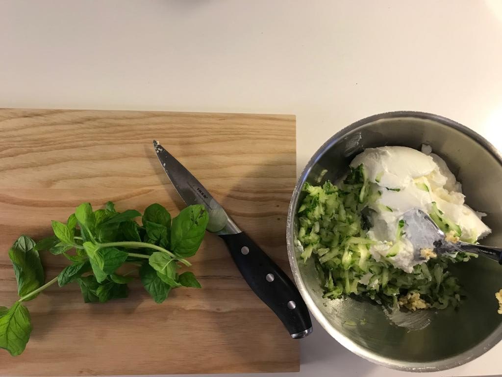 Raasta kurkku, purista kurkkuraasteesta ylimääräinen neste pois ja lisää jogurttiin. Hienonna tai purista valkosipuli ja lisää jogurttiin. Revi mintusta lehdet ja pienennä ne jogurtin joukkoon. Mausta ja nosta maustumaan jääkaappiin kelmulla peitettynä.