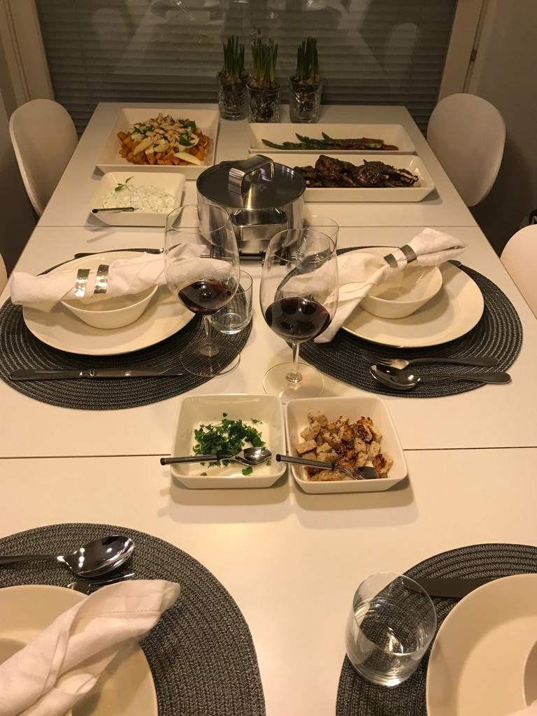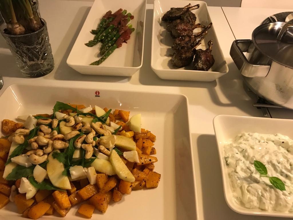Pojille maistui lammas myös erittäin hyvin pienen mietinnän jälkeen, samoin parsa ja paprikakeitto, varsinkin esikoiselle. Kurpitsasalaatti ei puolestaan ollut kummankaan mieleen, mutta meille vanhemmille kyllä oli.