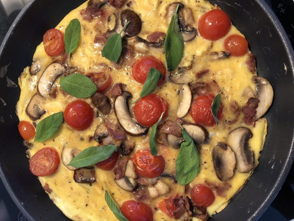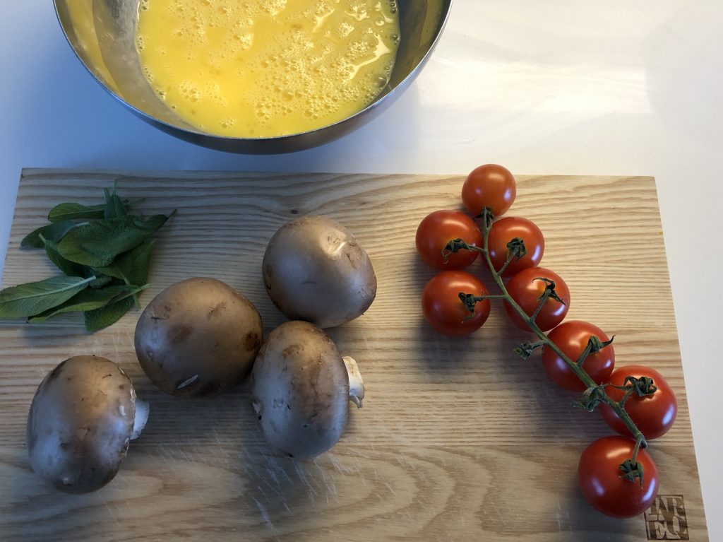 En ollut tehnyt tätä munakasta aiemmin. Ohje on Glorian ruoka&viini lehdestä vuodelta 2008. Käytin kirsikkatomaatteina terttutomaatteja, koska niissä on enemmän makua. Samoin herkkusienet ovat ruskeita, koska myös niissä on valkoisia enemmän makua. Tabascoa laitoin niin vähän, että sitä tuskin huomasi. Jos munakas olisi vain aikuisille laittaisin enemmän. Salvia on yrtti, josta pidän paljon ja se sopi mainiosti tähän munakkaaseen. Muuten salviaa tulee käytettyä melko harvoin, saltimboccassa yleisimmin.