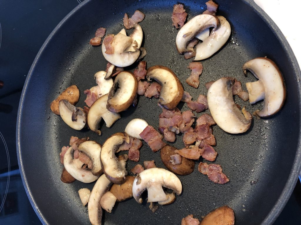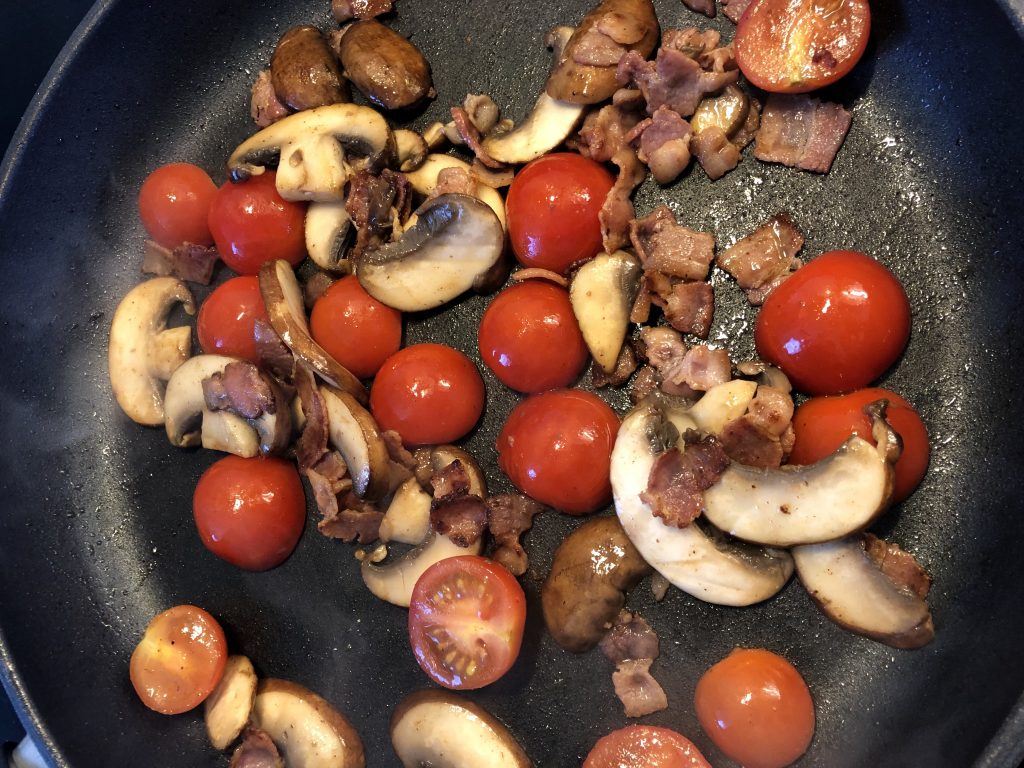 Suikaloi pekoni. Puhdista sienet, poista kanta ja suikaloi. Puolita kirsikkatomaatit. Paista pekoni rapeaksi pannussa. Lisää herkkusienet ja ruskista kevyesti.