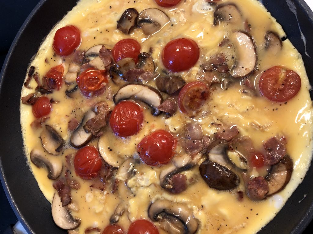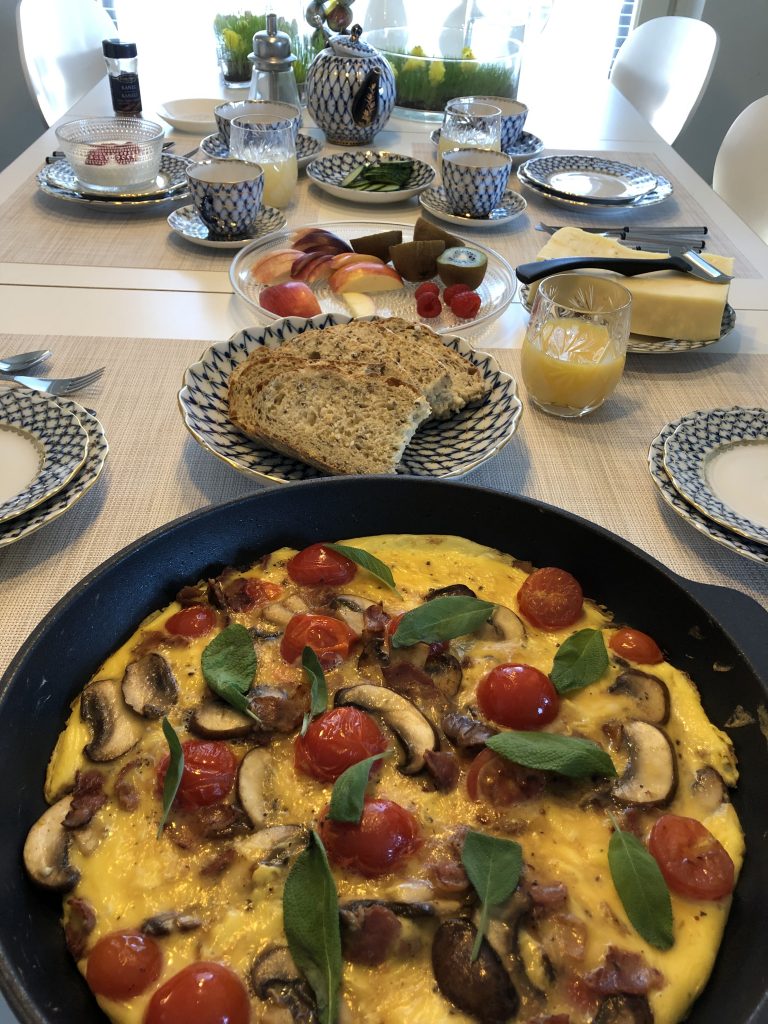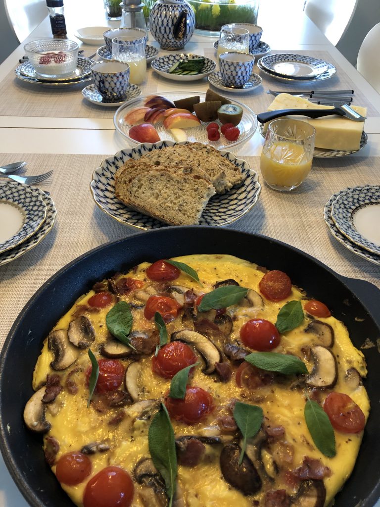 Lankalauantaina meillä oli rauhallinen aamu, koska poikien lätkätreenit ovat vasta iltapäivällä. Koska syömme illallisen-karitsan paahtopaistia- lätkäaikatauluista johtuen hieman myöhemmin, päädyin tekemään tukevamman aamupalan. Tämän munakkaan voimalla, pojat jaksoivat myös käydä futaamassa aamupäivällä lähikentällä.