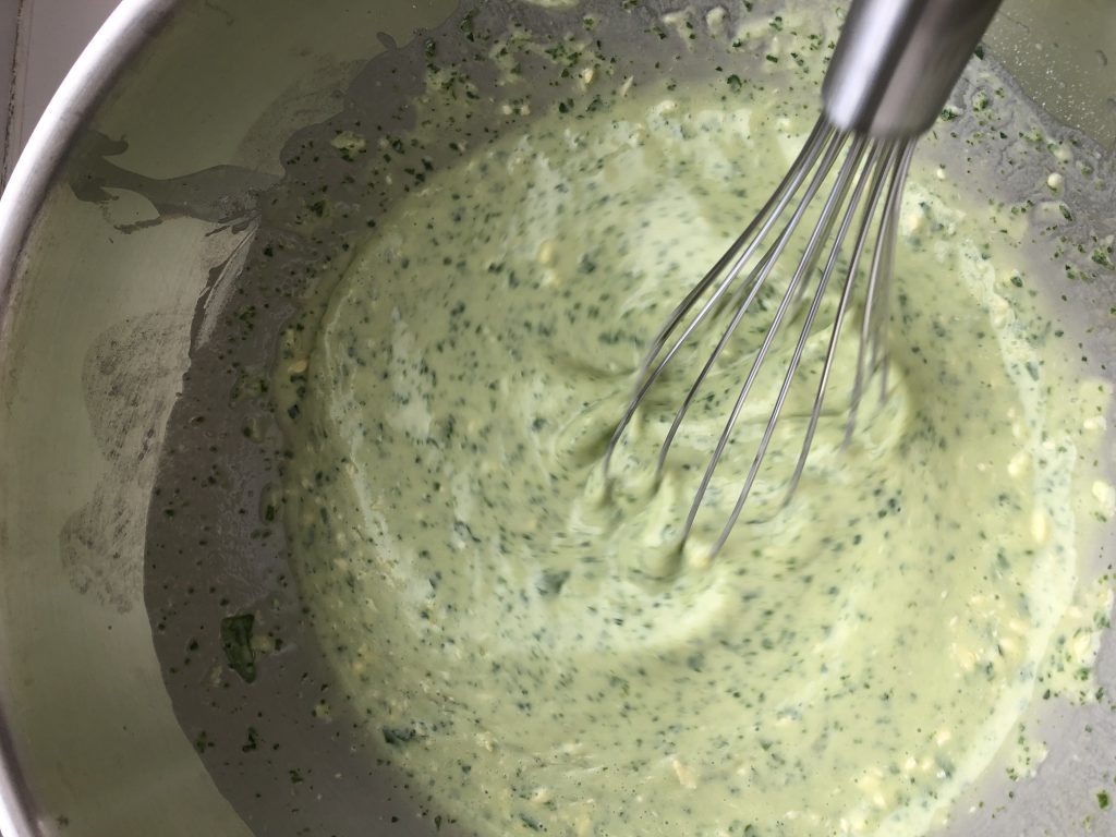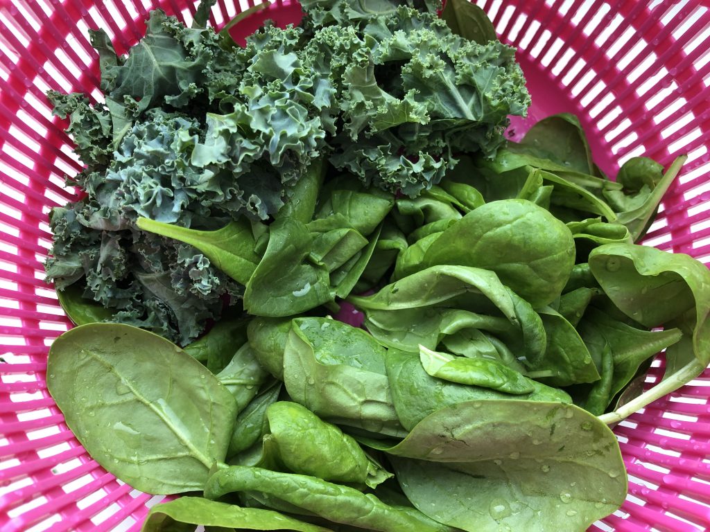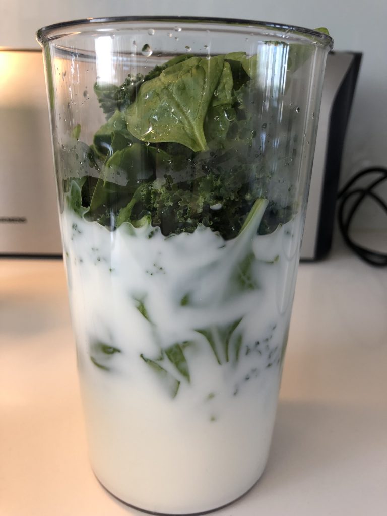 Huuhtele pinaatit ja lehtikaali. Mittaa maito astiaan ja lisää pinaatit myös. Soseuta sauvasekoittimella.