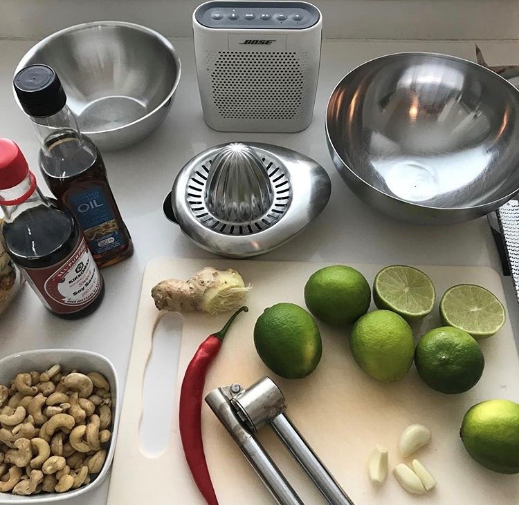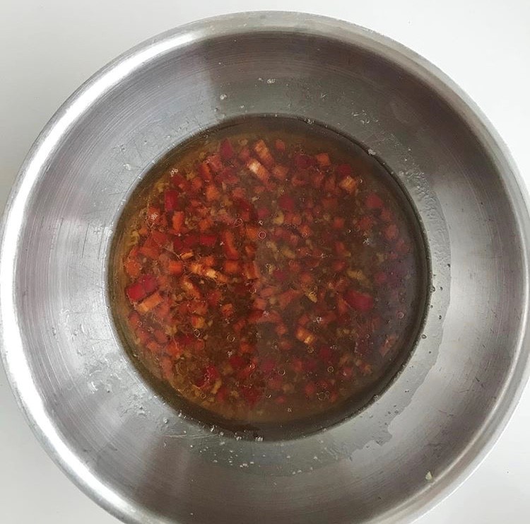 Tee kastike. Purista limen mehu, lisää öljy, soija, puristetut valkosipulinkynnet, raastettu inkivääri ja hienonnettu chili.