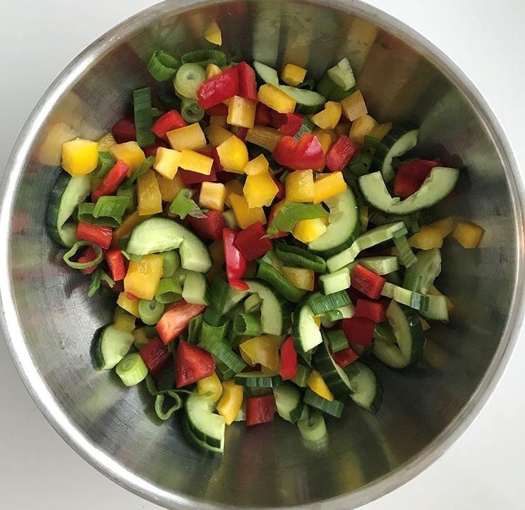Suikaloi paprikat ja sipuli. Halkaise kurkku ja poista siemenet kovertamalla pikkulusikalla, suikaloi siemenettömät puolikkaat. Paista broilerit.