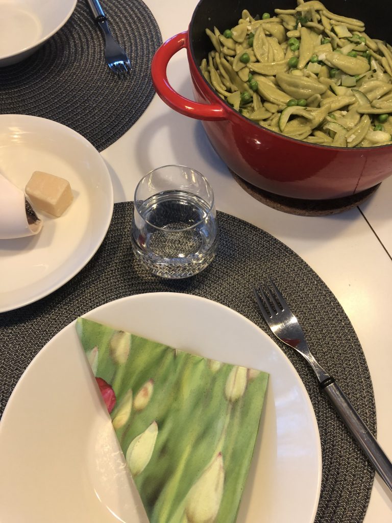 Pasta oli juuri niin hyvä kuin Hanna G ohjeessa lupasikin. Taas, kun raaka-aineita oli vähän, panostin laatuun ja valitsin pastaksi hieman parempaa pastaa. Kuopukselle tämä pasta ei maistunut, onneksi oli myös eilistä spaghetti bolognesia jäljellä, mutta esikoinen kyllä söi reippaasti, tosin lautaselle jäi useampi herne….