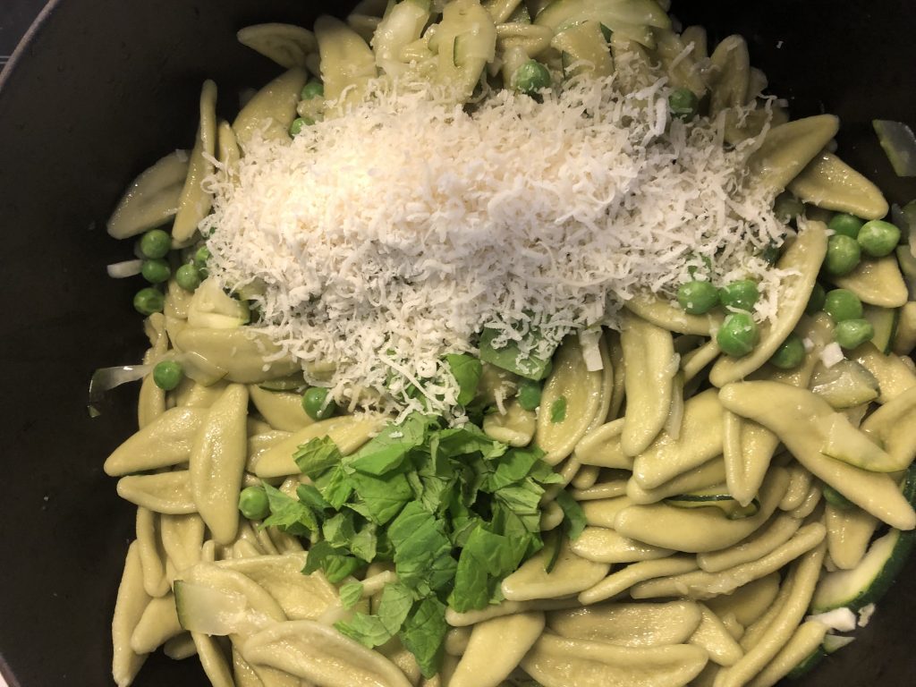 Sekoita ja tarjoa heti raastetun parmesaanin ja silputun mintun kera.