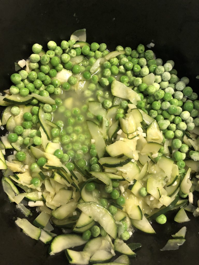 Lisää pataan silputtu valkosipuli ja valkoviini. Kiehauta niin, että alkoholi haihtuu. Kun pasta on melkein kypsää, ota 1 dl sen keitinvettä ja kaada pataan. Lisää jäiset herneet. Keitä puoli minuuttia hieman kovemmalla lämmöllä ja laske sitten taas lämpöä. Lisää pataan valutettu pasta, voinokare ja sekoita. Lisää myös silputtu minttu sekä parmesaaniraaste.