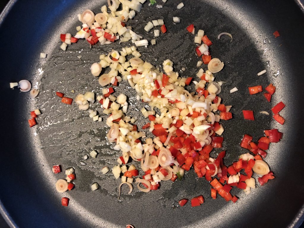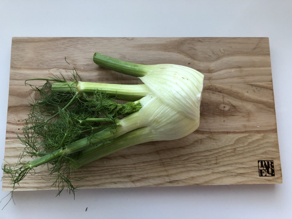 Paahda leivät ja voitele ne levitteellä ja laita leivälle muutama fenkolin siivu per leipä. Lorauta oliiviöljyä pannulle, lämmitä ja lisää pannulle inkivääri, valkosipuli, chili ja sitruunaruoho. Kuullota kevyesti.