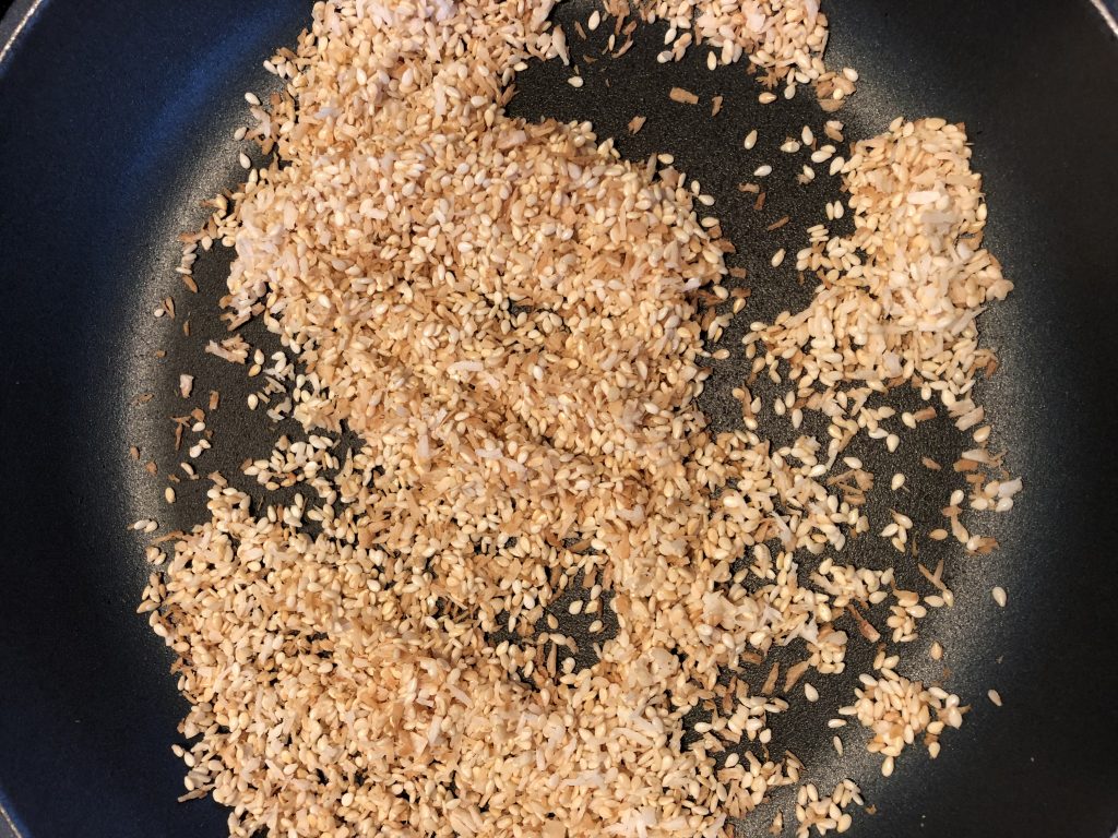 Paahda seesaminsiement kuivalla pannulla koko ajan sekoittaen. Kun siemenet alkavat saamaan väriä, lisää kookoshiutaleet. Jatka hetki paistamista. Ota pannu pois liedeltä ja jätä odottamaan.