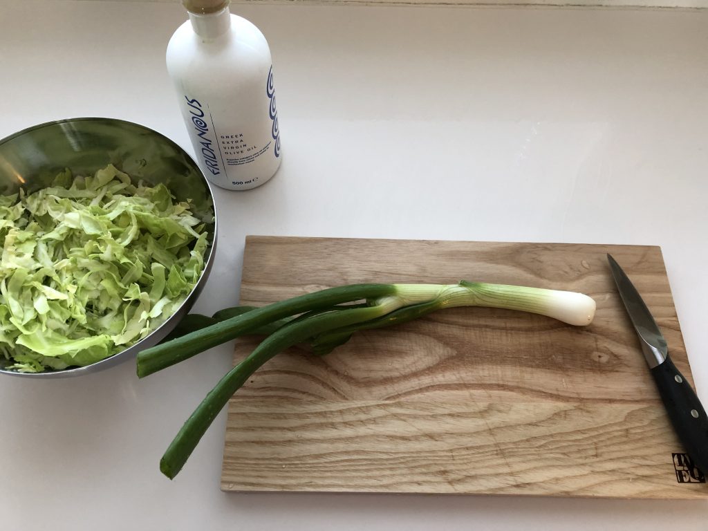 Raasta varhaiskaali juustohöylällä tai leikkaa veitsellä pieniksi suikaleiksi. Leikkaa sipulin valkoinen osa renkaiksi ja vihreä osa suikaleiksi. Silpu mintun lehdet.