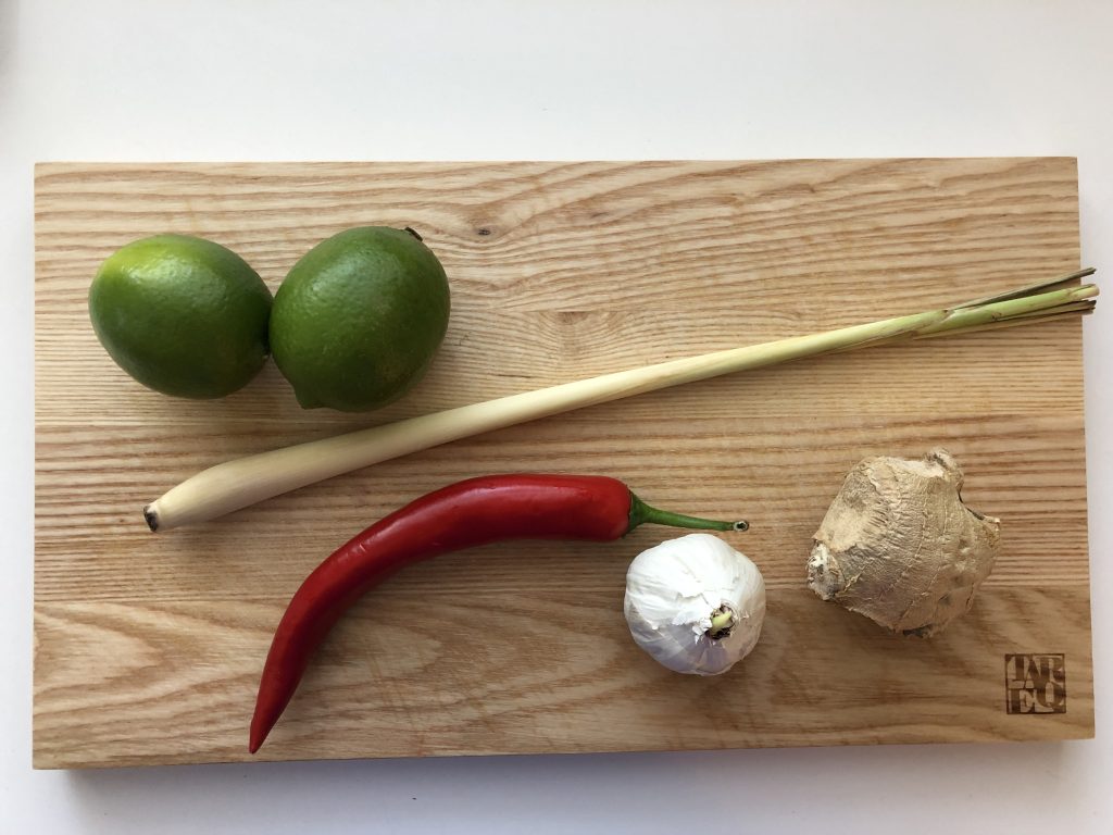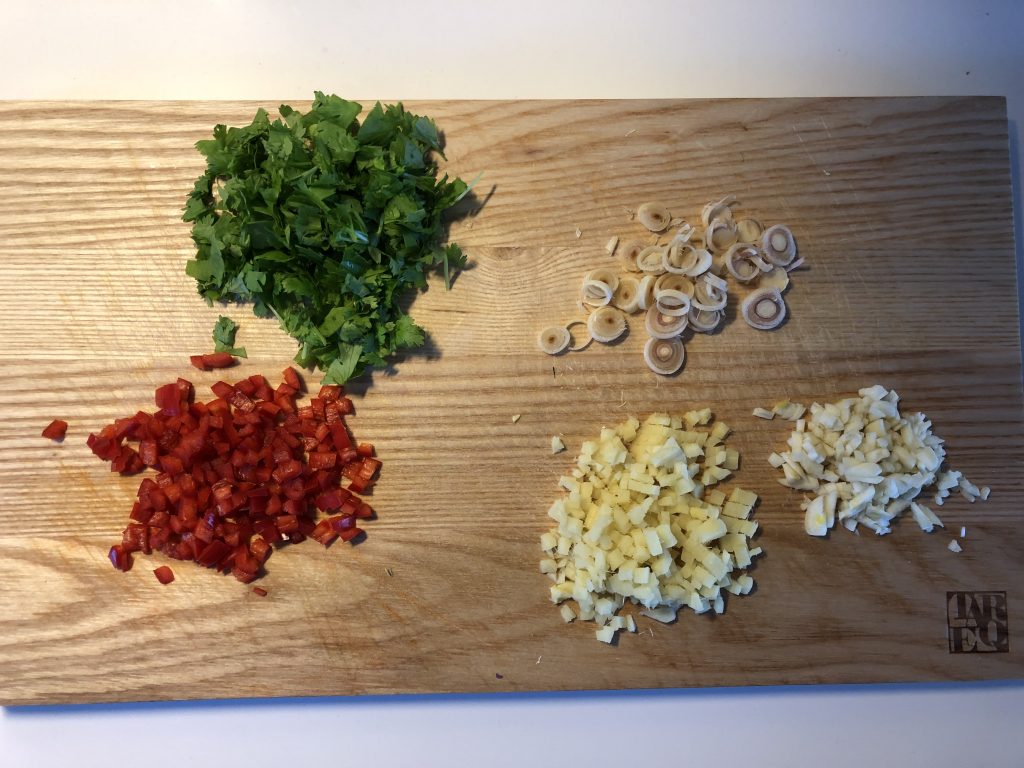 Leikkaa chili, inkivääri, valkosipuli ja sitruunaruohonvarsi pieniksi kuutioiksi.