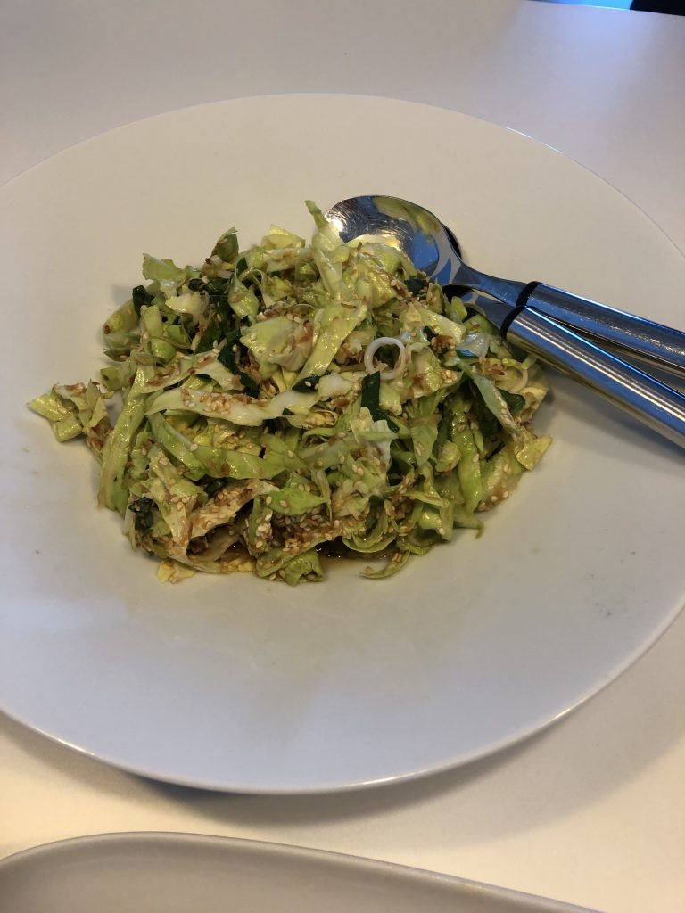 Laita kaali, sipuli ja minttu astiaan. Sekoita. Lisää jäähtynyt kastike. Sekoita. Lisää seesaminsiemenet ja kookoshiutaleet sekä ripaus sormisuolaa.