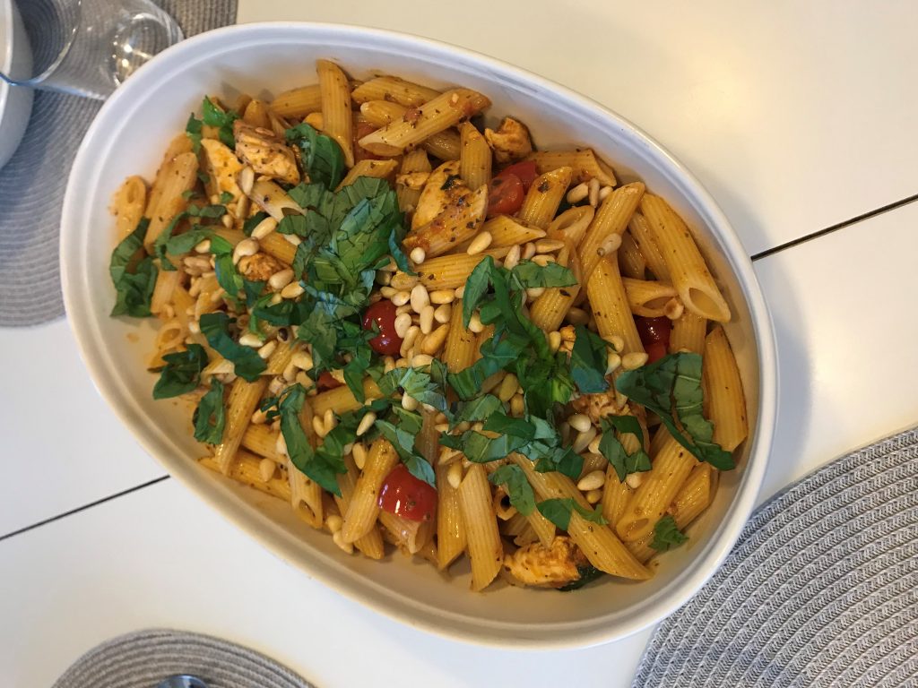 Broileripasta on varmasti kaikkien lätkäpastojen äiti. Tai minkä tahansa urheilijan pastojen pasta. Variaatioita on monia. Tässä yksi, jonka tein tänään nopeasti ennen toisen poikamme peliä. Ohje on alunperin Yhteishyvästä ja olen vähän tuunannut sitä meille sopivammaksi. En muuten koskaan osta valmiiksi marinoitua broileria. Marinoin itse, se on helppoa ja nopeaa. Aina tulee öljyä ja jotain happoa, sitruunaa/limeä tai viinietikkaa. Mausteet broilerin marinadiin poimin ruuan muista mausteista. Tänään latoin oliiviöljyä, sitruunaa, suolaa, mustapippuria ja basilikaa. Anna marinoitua niin kauan kuin ehdit odottaa.