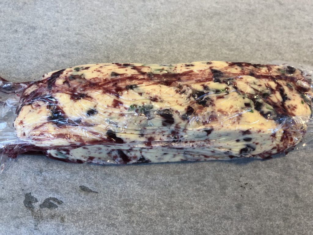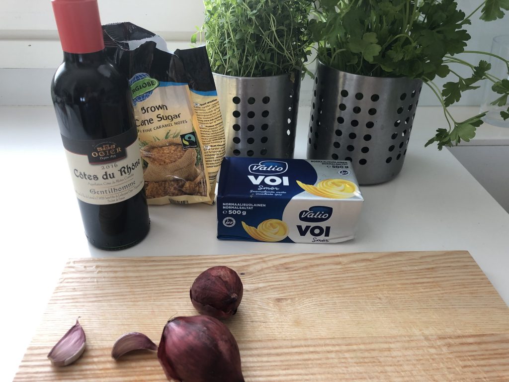 Kuori ja hienonna sipulit. Laita ne kattilaan viinin ja sokerin kanssa. Keitä, kunnes viinistä on jäljellä noin 0,5 dl. Jäähdytä. Anna voin pehmetä huoneen lämpöiseksi ja sekoita punaviini-sipulikastikkeen kanssa. Lisää silputut yrtit ja sekoita. Kääri kahdeksi tangoksi talouskelmun kanssa. Nosta jääkaappiin kovettumaan ja pakasta toinen tanko tulevaisuuden käyttöön.