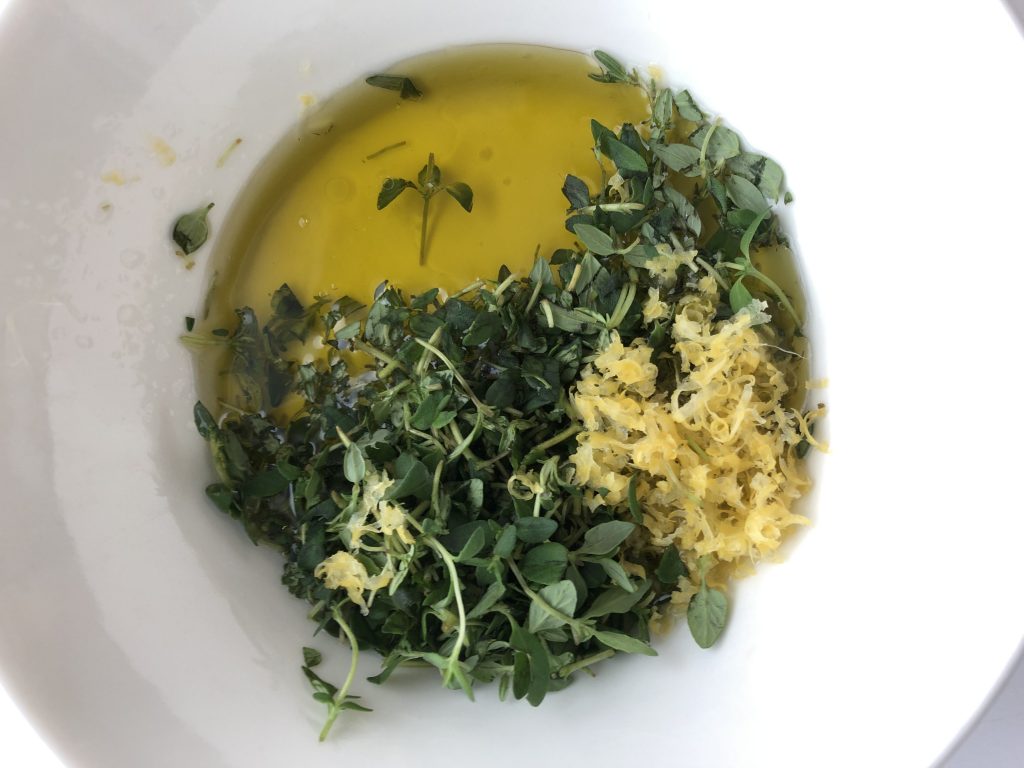 Aloita kastikkeesta. Pese sitruuna ja raasta sen keltaista kuorta yksi ruokalusikallinen. Purista sitruunasta mehua kaksi ruokalusikallista. Hienonna timjami ja yhdistä kastikkeen ainekset.