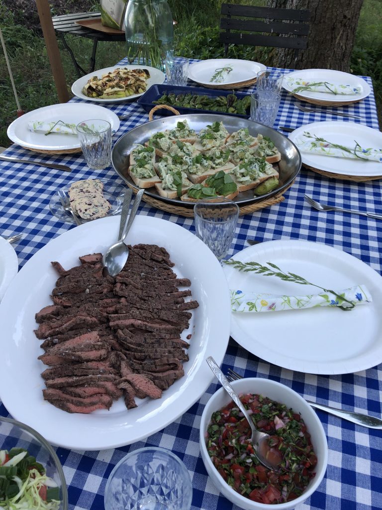 Vietimme tämän vuoden juhannuksen appivanhempieni mökillä saaressa. Keli oli mitä parhain ja söimme kaikki ruokailut ulkona auringonpaisteessa. Välillä tuuli ja hieman kovemminkin, mutta se piti vain hyttyset loitolla. Juhannuksen ruokien pääraaka-aineet olivat selvät, flank steak, kana ja porsaan sisäfile. Näiden ympärille kehiteltiin vain sitten lisukkeet. Keittiössä hääri useampi kokki ja hyvin ruuat valmistuivat, eikä rasittanut liikaa ketään. Koska saaressa ei ole sähköä eikä juoksevaa vettä, niin kokkaaminen on hieman kotioloja työläämpää. Tästä johtuen tein myös kaikki mahdolliset kastikkeet ja soosit valmiiksi kotona. Juhannusaaton ruuista olin tehnyt kotona jo halloumisalaatin kastikkeen, punaviiniyrttivoin, sekä kääretortun, josta tein kakkupyramidin appiukon synttäreiden kunniaksi. Kakusta teen oman postauksen.