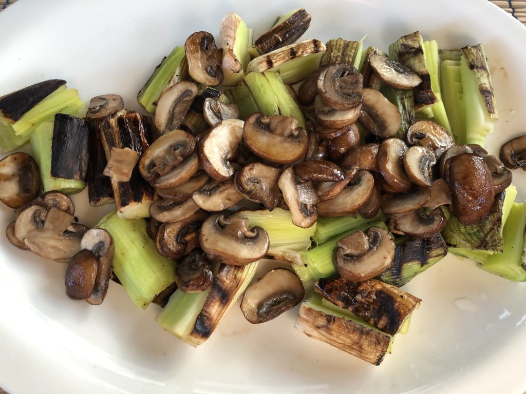 Grillaa purjoa kuumassa grillissä noin 15 minuuttia eli kunnes pinta on hiiltynyt, mutta sisus vielä napakkaa. Halkaise purjon palat grillaamisen jälkeen. Paista suikaloidut herkkusienet voissa ja mausta kevyesti mustapippurilla ja sormisuolalla.