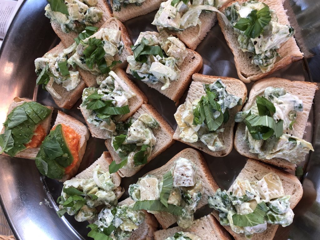 Sekoita ranskankerma, sitruunanmehu ja chili kulhossa. Hienonna basilika ja lisää raskankerman joukkoon. Viipaloi artisokansydämet ja avocadonliha ja lisää ne ranskankerman joukkoon myös. Viipaloi myös sipuli ja lisää joukkoon. Sekoita varovasti. Annostele leipien päälle ja koristele lopuksi basilikasilpulla.