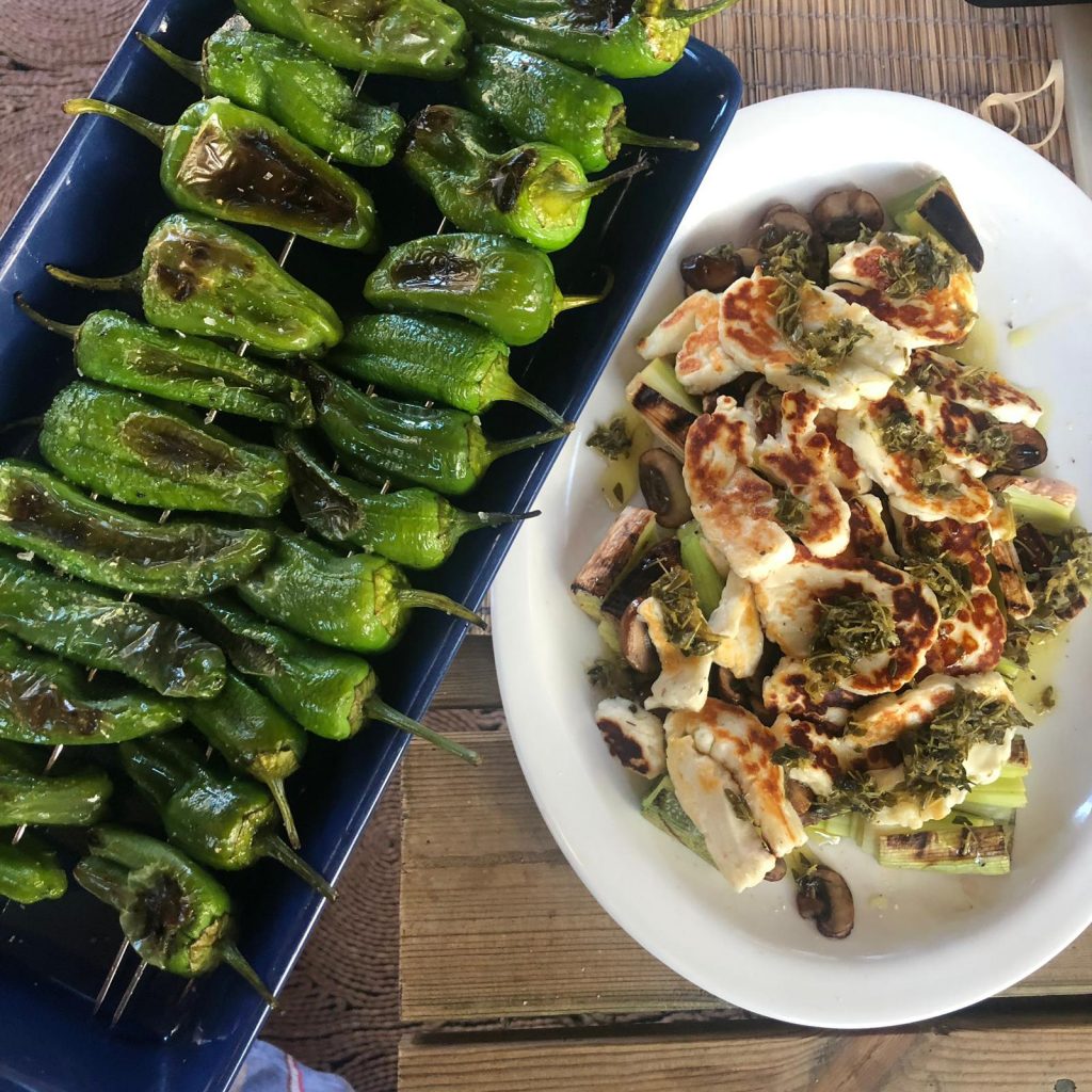 Pyöräytä paprikat kevyesti öljyssä ja laita varrastikkuihin. Nosta paprikat grilliin ja anna niiden tummentua ensin kunnolla toiselta puolelta ja sitten toiselta puolelta. Kun paprika alkaa rypistyä kasaan, se on valmis. Suolaa valmiit paprikat reippaasti sormisuolalla.