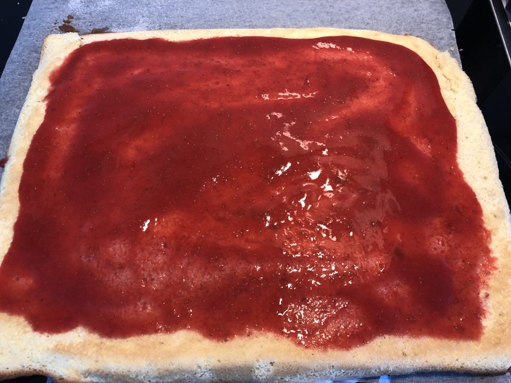 Valmista täyte. Soseuta mansikat sauvasekoittimella ja lisää sokeri. Sujauta leivinpaperin etureunan alle kostutettu talouspaperin pala. Näin leivinpaperi pysyy paikoillaan, kun rullaat levyn kääryleeksi. Levitä mansikkasosetta melkein reunoihin asti. Jätä itseäsi vasten olevan reuna eniten ilman täytettä, näin se ei puristu pois, kun käärit kääretortun loppuun.