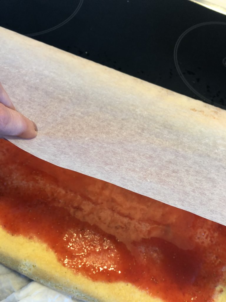 Tartu reippaasti leivinpaperiin ja käännä ensimmäinen sivu ohuena, mutta tiukasti päällekäin. Lähde vetämään leivinpaperia ja näin torttu rullautuu kääryleeksi. Jätä tortun sauma puoli alaspäin. Laita kääretorttu kylmään, ainakin tunniksi, mutta voit tehdä kääretortun valmiiksi jo edellisenä päivänä.