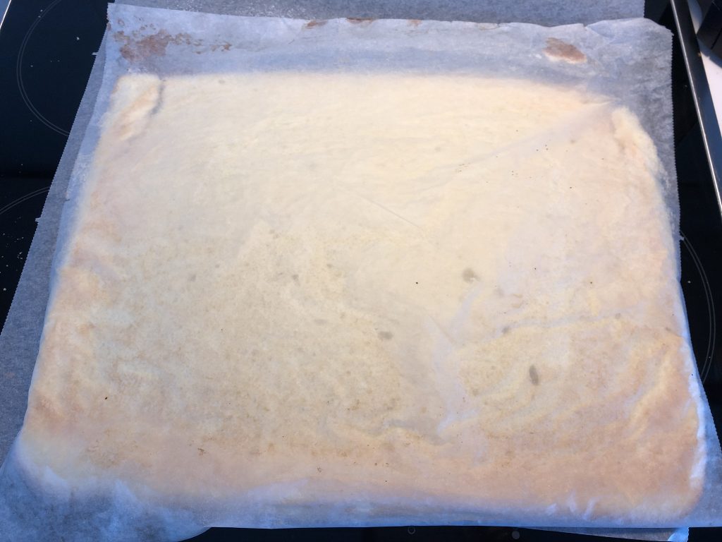 Kaada taikina voidellulle leivinpaperille uuninpellille ja paista uunin keskitasolla 7-10 minuuttia kauniin keltaiseksi. Laita pöydälle valmiiksi leivinpaperi ja ripottele siihen kevyesti kauttaaltaan sokeria. Kumoa torttulevy heti uunista oton jälkeen sokeroidulle leivinpaperille. Kostuta päälimmäistä leivinpaperia kevyesti ja irrota leivinpaperi taikinasta.