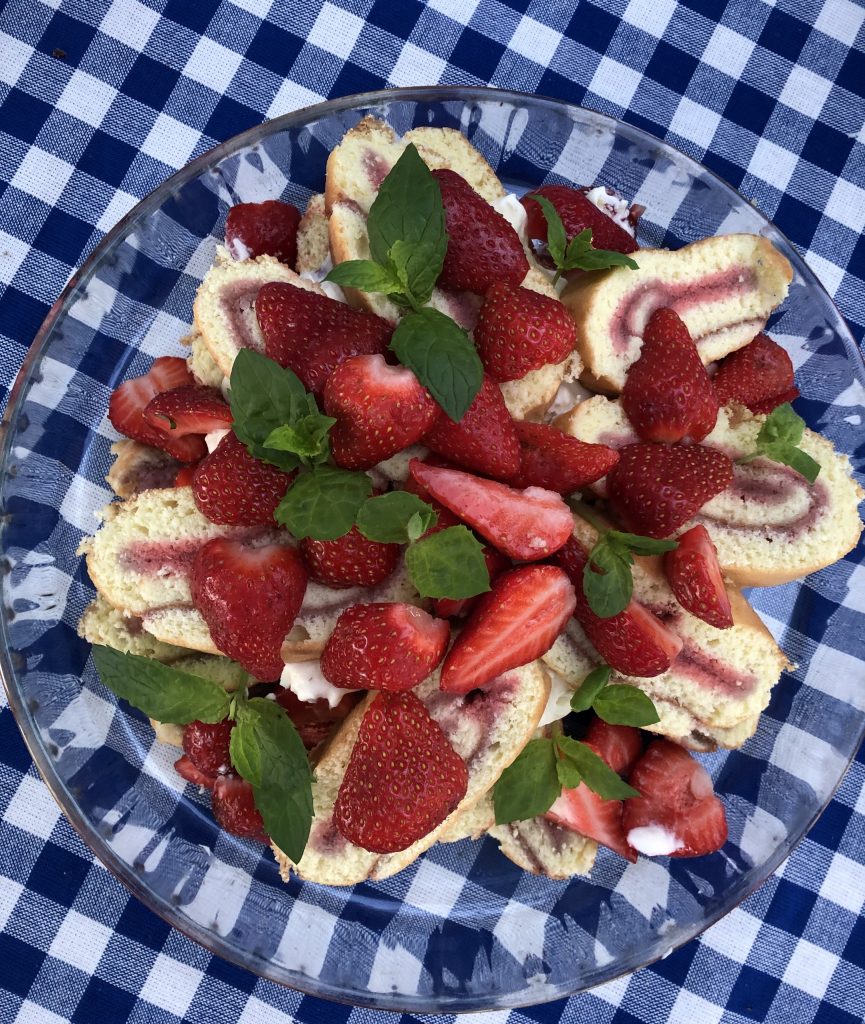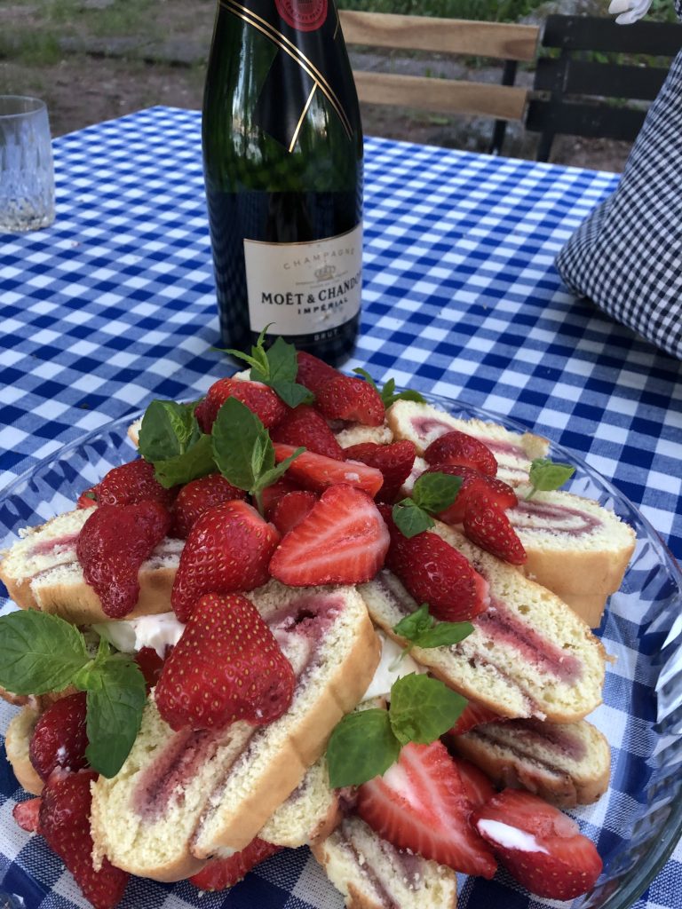 Kääretorttu pakattiin voipaperiin ja sanomalehteen ja se kulkeutui ehjänä mökille. Paikan päällä viipaloin sen ja kokosin pyramidiksi. Väliin tuli kermavaahto-mascarponevaahtoa ja koristelin kokonaisuuden runsaasti kotimaisilla mansikoilla ja mintun lehdillä. Kakusta riitti hyvin yhdeksälle hengelle ja herkuttelevat lapset saivat toisenkin palan.