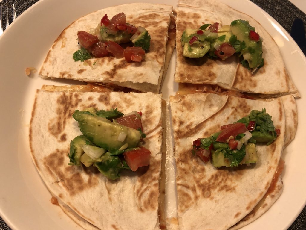 Olimme syöneet aikaisin ja illalla teki voileipää tuhdimpaa iltapalaa mieli. Minulla oli kaikki nämä ainekset valmiina kaapissa, joten tämä iltapala syntyi helposti. Tein ensin avocadosalsan ja sitten paistoin quesadillat kuivalla pannulla nopeasti molemmin puolin.
