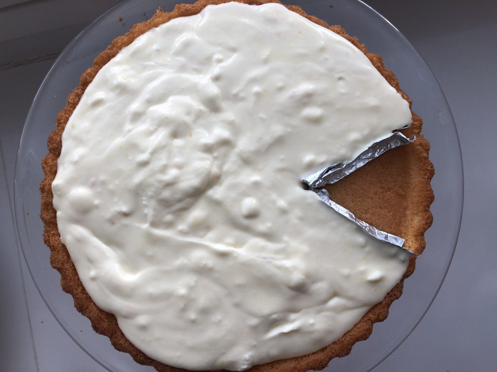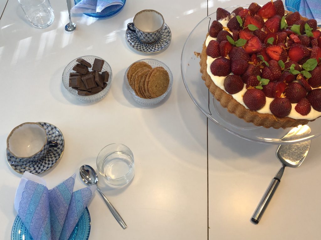 Eräs vieraistamme ei pidä kermavaahdosta tai tuorejuustosta, joten kehystin hänelle yhden osan kakusta foliolla, johon ei näin ollen täytettä tullut. Jälkikäteen ajateltuna, olisin voinut laittaa siihen edes soseutettua mansikkaa, tai hilloa tai jotain muuta kostuketta, nyt pelkkä torttupohja ja mansikat olivat vähän ankea kokonaisuus….Mutta ainakin kaikki saivat kakkua syödäkseen!