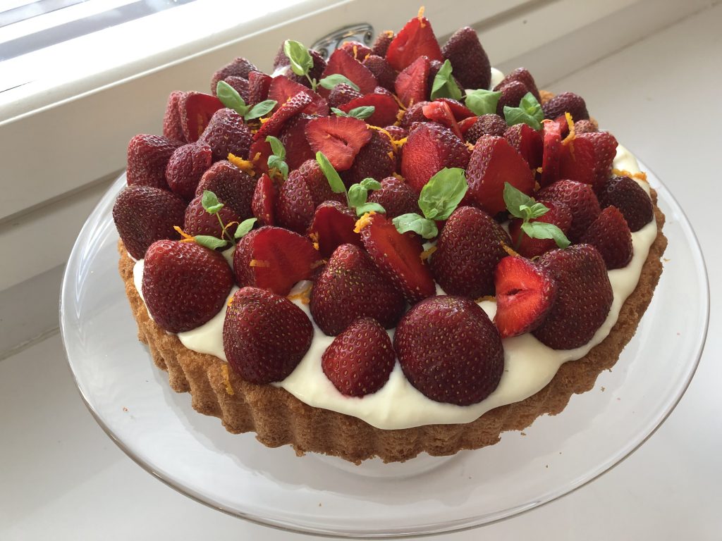 Heinäkuussa meillä vietetään syntymäpäiviä ja teen silloin aina mansikkakakun, jos olemme kotona, emmekä reissussa. Tämän kakun olen tehnyt jo useamman kerran, koska pidämme koko perhe tästä makuyhdistelmästä. Meistä ei kukaan juurikaan pidä perinteisistä kermakakuista, ja appelsiini-tuorejuusto tuo mukavaa särmää tähän kakkuun. Olen myös joka kerta käyttänyt valmista torttupohjaa, koska lämpimällä kelillä kuumassa keittiössä leivonnaisten paistaminen ei juurikaan houkuttele.